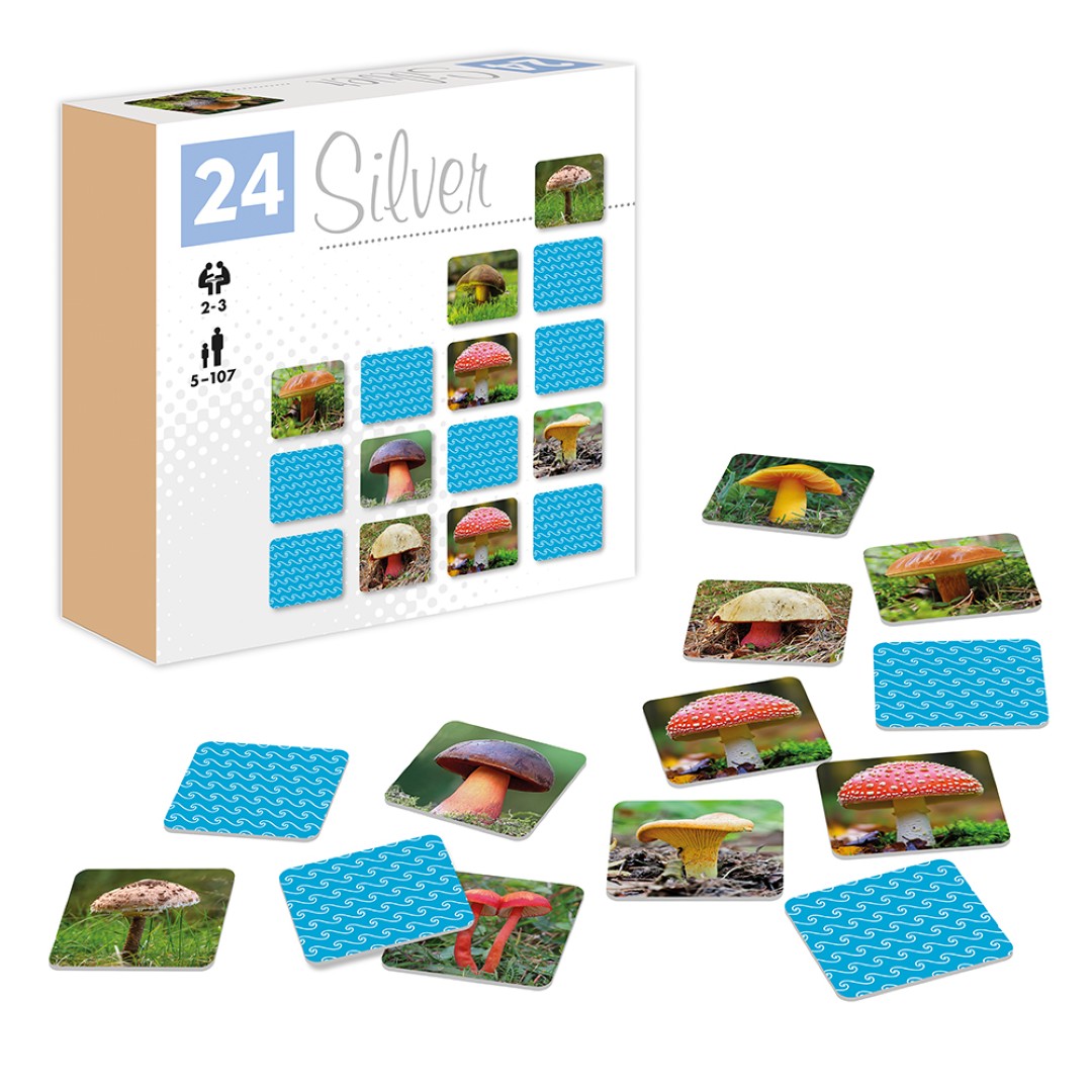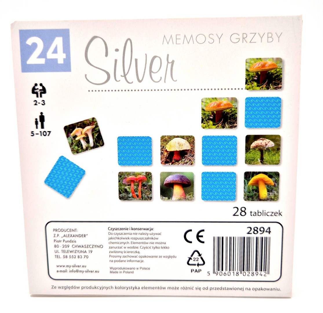 "Memosy" z serii Silver to klasyczna gra, w której wygrywa ten, kto najlepiej zapamięta położenie par tych samych obrazków. Tabliczki rozkładamy na stole rewersem do góry, a potem odkrywamy po dwie na raz i staramy się zapamiętać ich położenie, aby odnaleźć wszystkie pary.