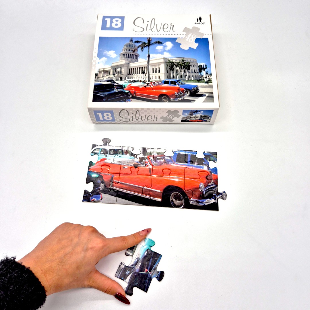 „Puzzle” z serii Silver zostały stworzone z myślą o komforcie i potrzebach osób starszych oraz osób z ograniczoną sprawnością dłoni. Duże, solidne elementy o ergonomicznym kształcie są łatwe do chwytania, co umożliwia wygodną i bezstresową zabawę. Każdy zestaw zawiera starannie dobrane wzory – od uspokajających krajobrazów po proste, kontrastowe ilustracje – które ułatwiają rozpoznawanie i dopasowywanie fragmentów, wspierając koncentrację oraz pamięć.